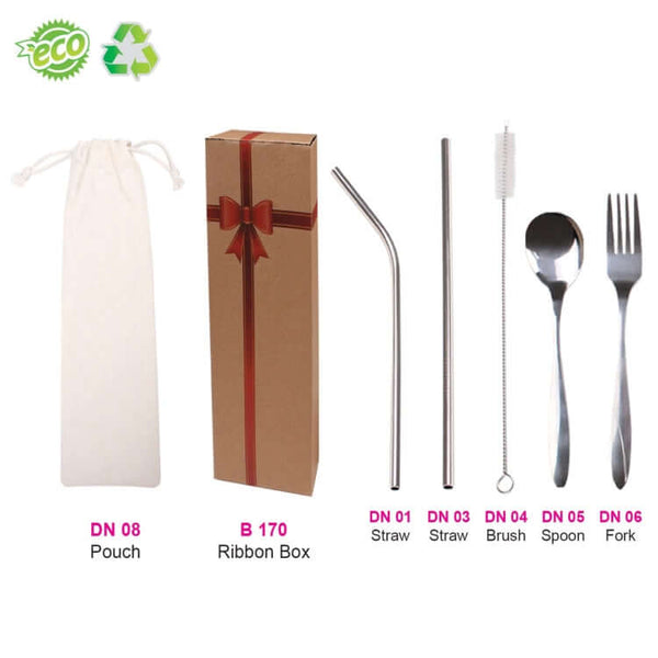 Eco-Friendly Stainless Steel Straw & Cutlery Set is the perfect solution for those looking to reduce their plastic waste and make more sustainable choices. This set includes a canvas pouch and a ribbon box, both made from eco-friendly materials. The pouch measures 25cm (L) x 7cm (W) and the ribbon box measures 25.3cm (H) x 6.1cm (L) x 3.1cm (W). The straw and cutlery set are made from high-quality stainless steel, ensuring durability and longevity. The natural color of the pouch adds a touch of simplicity and elegance. Each set weighs approximately 100g, making it lightweight and easy to carry around. Make a positive impact on the environment with this eco-friendly set from AbrandZ, a trusted corporate gifts supplier in Singapore.