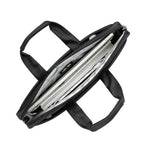Crafted from water-resistant polyester, it features a contrasting silver-lined interior that adds a touch of elegance. The bag includes a dedicated laptop compartment, a section for documents, and a pocket for tablets up to 10.1 inches.