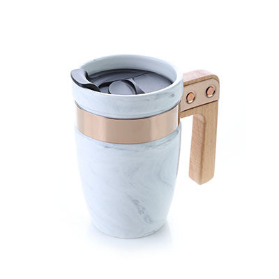 The Marble Ceramic Mug with SS Rim and Wooden Handle is a stunning addition to your drinkware collection. This elegant mug features a beautiful marble pattern on its white ceramic body, complemented by a shining rose gold stainless-steel rim.