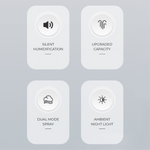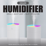 Introducing the HM400 - a 400ml humidifier with a colourful ambience light that will enhance your air quality and create a soothing atmosphere in any room. Made with high-quality ABS material, this humidifier is durable and lightweight, weighing only 123g. Its compact size of 12.6cm x 7.6cm x 7.6cm makes it easy to place on any surface without taking up too much space.The HM400 humidifier not only adds moisture to the air, but also provides hydration with its fine mist and large spray capabilities. This helps to combat dryness and improve the overall air quality in your home or office. The colourful ambience light adds a touch of relaxation and can be adjusted to suit your mood.With a micro USB input of 5V-1A, this humidifier is easy to charge and can run for 3-6 hours on a single charge. Its 400ml capacity ensures that it can provide continuous mist for a longer period of time. Don't let dry air affect your health and well-being, get the HM400 humidifier with colourful ambience light today and experience the benefits of improved air quality and hydration.