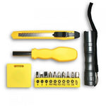 Introducing the Compact Tool Set, a must-have for any handyman or DIY enthusiast. This 14-piece set comes neatly packaged in a sleek black pouch, making it easy to store and transport. The set includes a screwdriver handle, 9 screwdriver bits, a socket adaptor, a tape measure, a cutter knife, and a torch light, providing you with all the essential tools for any project.