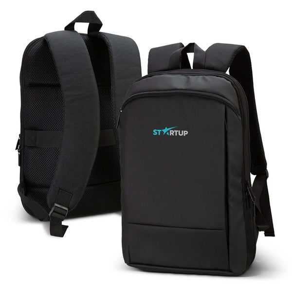 Crafted from reverse 600D polyester with a soft-touch PU coating, this backpack is both durable and water-resistant. It features a large zippered front compartment and a padded inner sleeve that accommodates devices up to 16 inches.
