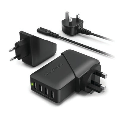The RavPower 4 Port Travel Wall Charger combines convenience and versatility, making it the perfect companion for your travels. With one charger and three options, you can customize your setup by choosing between a 5ft cable or two adapters with EU/UK plugs.