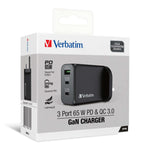 The Verbatim 3 Port 65W PD 3.0 & QC 3.0 GaN Charger utilizes advanced GaN technology, offering a compact design with enhanced power efficiency. This charger features two Type C PD ports and one USB-A port, allowing for versatile charging options.